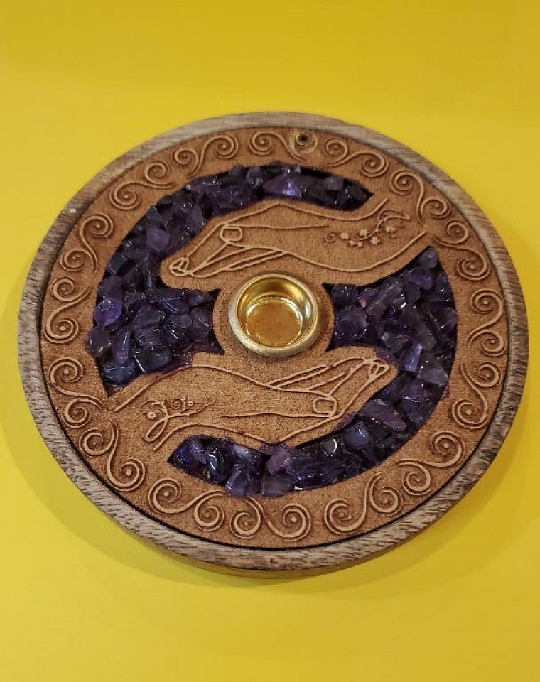L'améthyste est reconnue pour ses propriétés spirituelles et apaisantes. Ce porte-encens mesure 10 x 10 cm à 15,00 €.