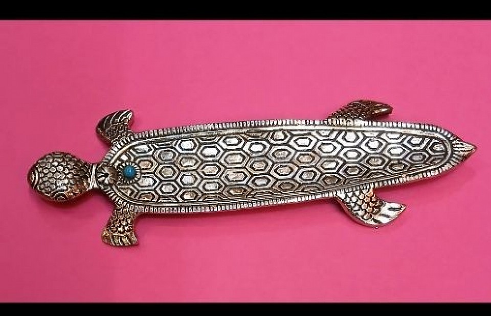 Ce porte-encens en forme de tortue en métal est à la fois décoratif et symbolique. Avec des dimensions de 21 x 7,5 cm, il est vendu à 10,00 €.